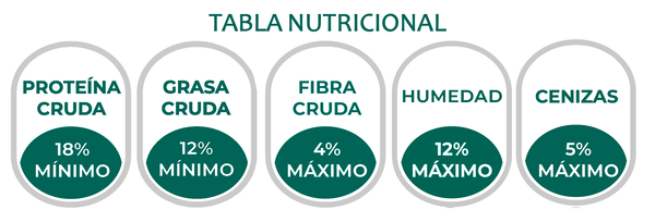 Maíz, Trigo, Pasta de Soya, Salvado de Trigo , Harina de Cempasúchil (Tagetes Erecta) , Zanahoria, Calabaza, Chícharos, Espinaca, Granada, Manzana, Moras, Papaya, Arándanos, Alfalfa, Extracto de Yucca, Celulosa, Calcio, Antioxidantes (Tocoferoles), Espirulina, Aceite de Soya , Complejo de Vitaminas (A, D3, E, K, C, Vitaminas del complejo B, Ácido Fólico).