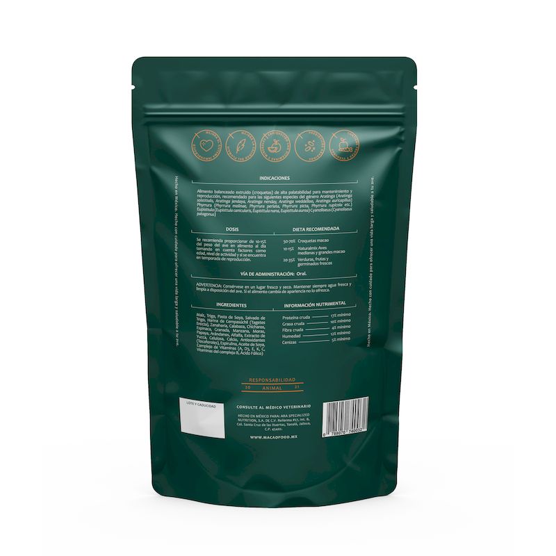 El proceso de extruido mediante el que se fabrican nuestras croquetas permite garantizar la seguridad de los alimentos. Además de facilitar la digestión de los alimentos mejorando con ello la absorción y asimilación de nutrientes. Con cada croqueta macao te aseguras de estar brindando a tu emplumado los nutrientes necesarios para que pueda gozar de una vida sana y larga a tu lado.
