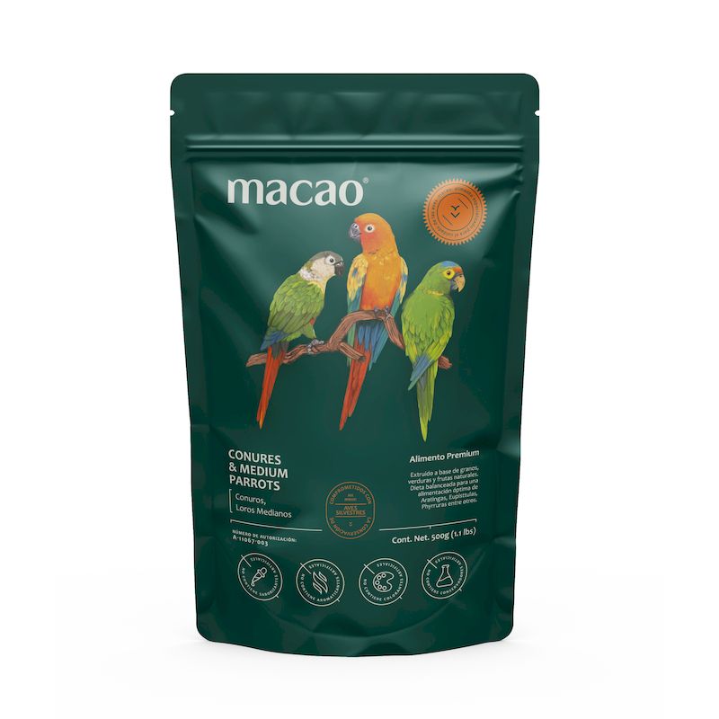 Conures & Medium Parrots son croquetas fabricadas a base de extruidos de granos, cereales, verduras y frutas 100% naturales. Especialmente formuladas para especies del género Aratinga, Eupistulla, Phyrrura, Cyanoliseus entre otros. Nuestras croquetas se encuentran adicionadas con vitaminas y minerales que aportan todos los micronutrientes necesarios para mantener un óptimo estado de salud de los loros que las consumen, mejorando su sistema inmunológico y ayudando a prevenir enfermedades. Contienen además prebióticos para mejorar la salud digestiva de tus emplumados, mejorando la consistencia de las heces.